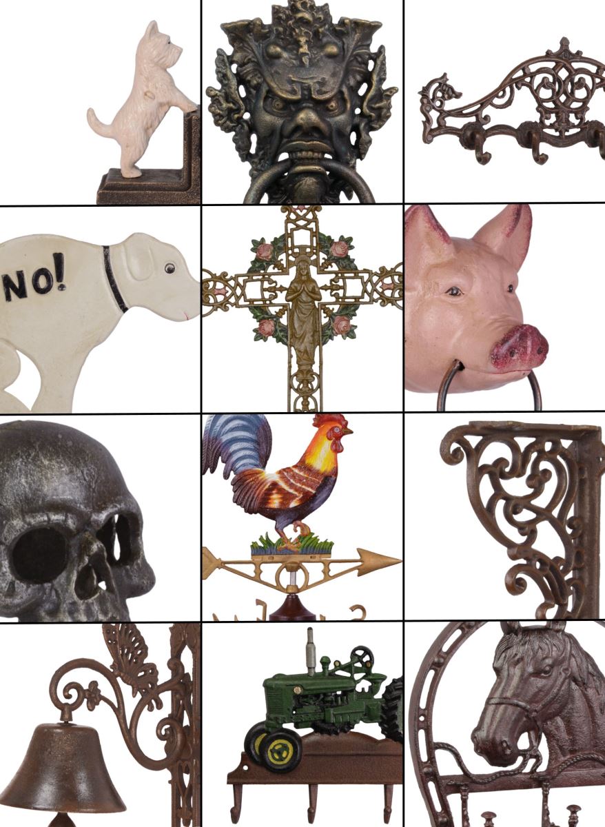 Ons assortiment van gietijzeren decoratie artikelen is heel breed. Zo verkopen wij ook gietijzeren deurkloppers, tuinbanken, boekensteunen, schapdragers, wandfontijnen en kapstokken.